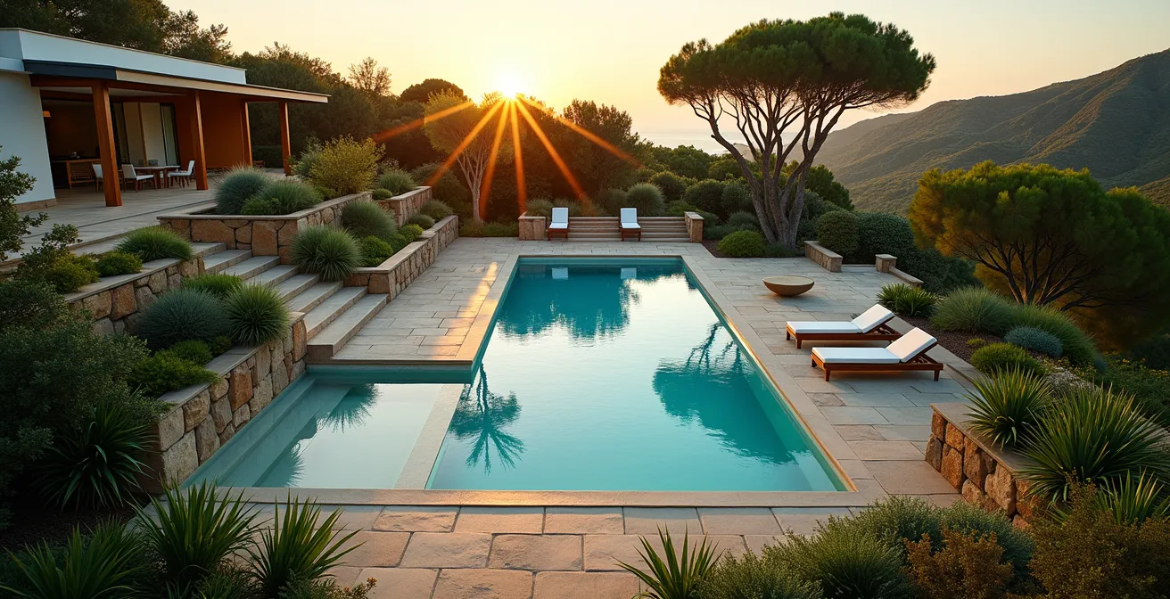 Le choix des espèces végétales conditionne l’ensemble de ces bénéfices. La végétation méditerranéenne cumule les avantages : résistance à la chaleur, feuillage persistant qui maintient la protection toute l’année, croissance lente limitant les interventions, et absence de fruits tombants qui pollueraient le bassin. Lavande, romarin, olivier et cyprès constituent la base d’une palette fonctionnelle.